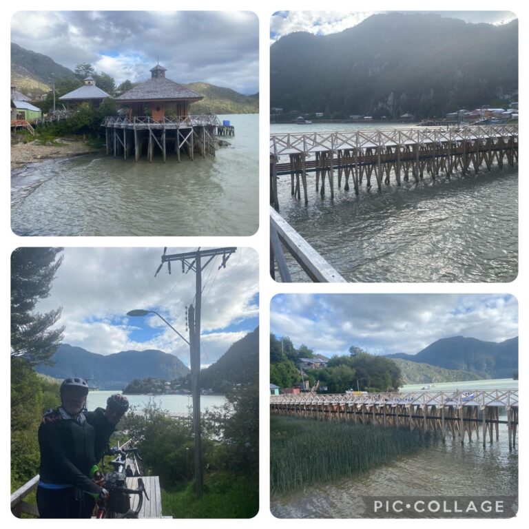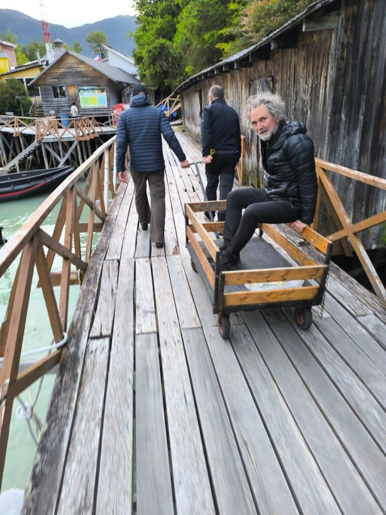 Caleta Tortel is a seaside village with wooden walkways everywhere, allowing for long strolls right by the water. We arrived very tired, especially Nicola, who was dealing with several aches and pains. To get him to dinner, we ended up transporting him in a small cart. The video of Nicola being wheeled around is hilarious, especially with him grumbling at Sebastián, who was accused of leading us the wrong way to the restaurant.